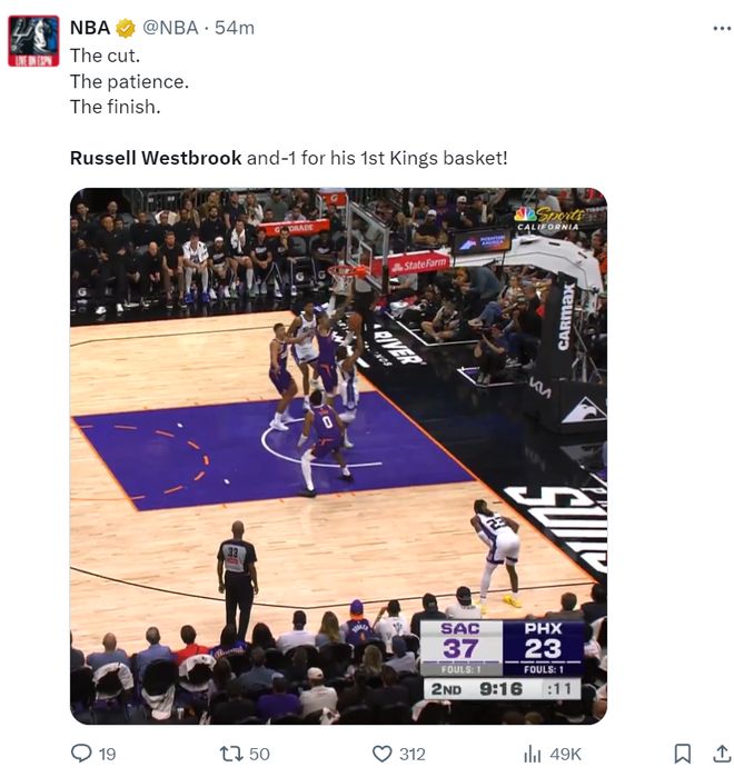 这场比赛是拉塞尔-威斯布鲁克在国王队的首秀,此前的季前赛他一场都没打,他在首节还剩5分钟时替补登场,他是打施罗德的替补,可登场后两个中投都未能命中,首节0分,他国王的第一分来自第二节的一次篮下2+1,可这一球后他又是一波3中0,仅仅半场6中1拿3分5篮板1助攻1盖帽。